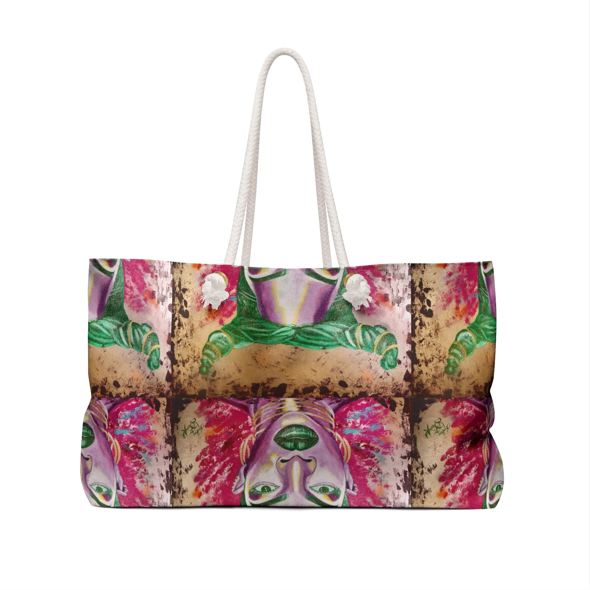 A bold, art-forward weekender bag that carries more than just clothes — it carries attitude. The wide, T-bottom silhouette opens to a roomy interior lined in soft cream sheeting. Lightweight spun polyester holds a vibrant, painterly portrait print with jewel-toned greens and fuchsia accents that repeat across the exterior, while sturdy cream rope handles threaded through gold-color grommets add a tactile, nautical contrast. Sized to hold weekend clothes, a toiletry kit, and a pair of shoes, it’s the kind of bag you reach for when you want your carry to start a conversation. Assembled in the USA from globally sourced parts, it’s built to travel and made to be seen.